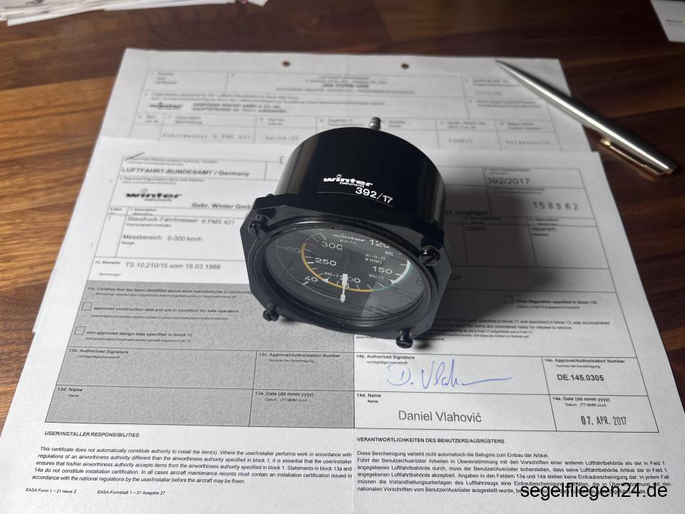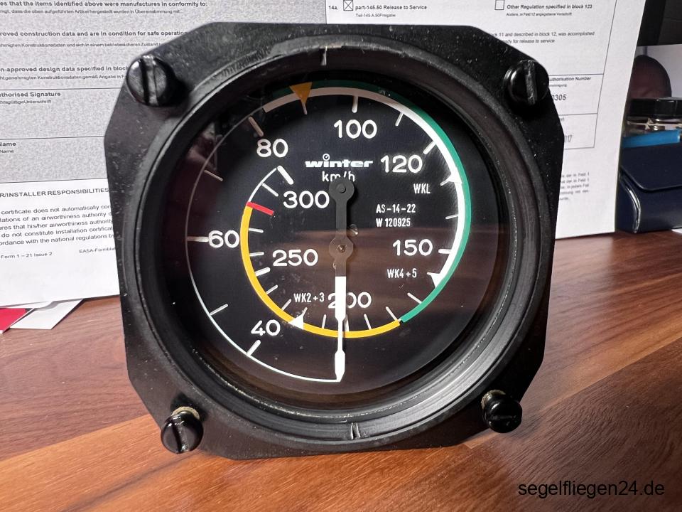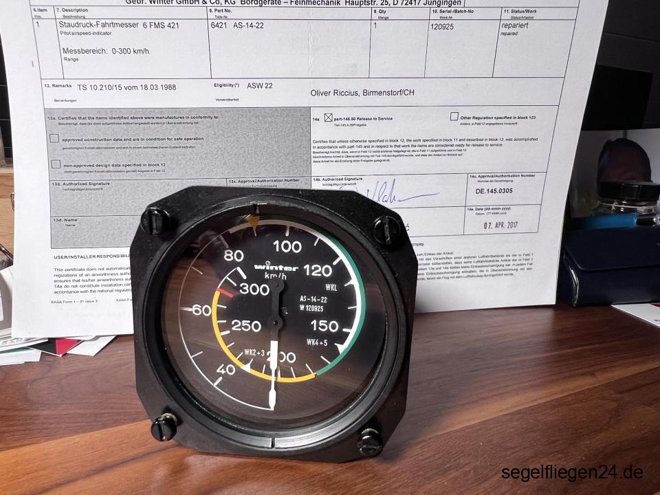 Winter Fahrtmesser 6 FMS 421, 80 mm, Typ AS-14-22, Werk-Nr. 120925, Messbereich 0-300 km/h, hergestellt 16.09.1999 inklusive Form 1, grundüberholt durch Winter April 2017 ebenfalls mit Form 1, wegen Instrumentenwechsel abzugeben.